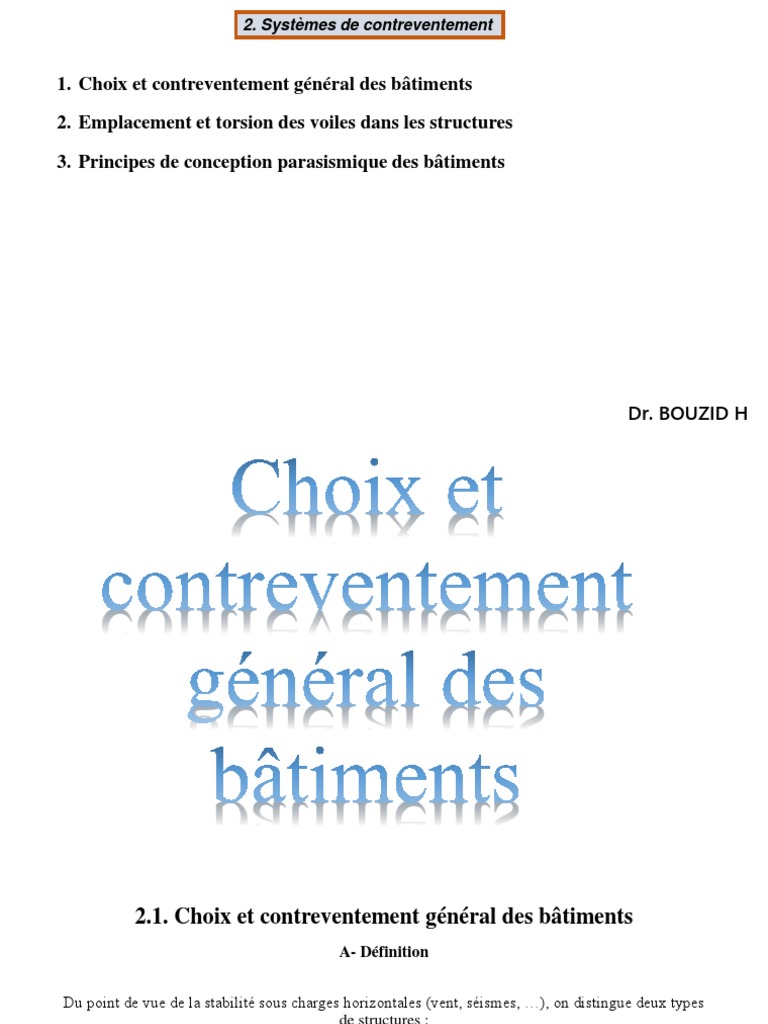 Grands bâtiments contreventements dynamique des structures calcul automatique méthodes et application pratique. By Moula Chouaib-août 30 2019. SYSTEMES DE CONTREVENTEMENTS 1-introduction Le contreventement permet dassurer une stabilité horizontale et verticale de la structure lors des secousses qui rappelons-le ont des composantes dans les trois directions.